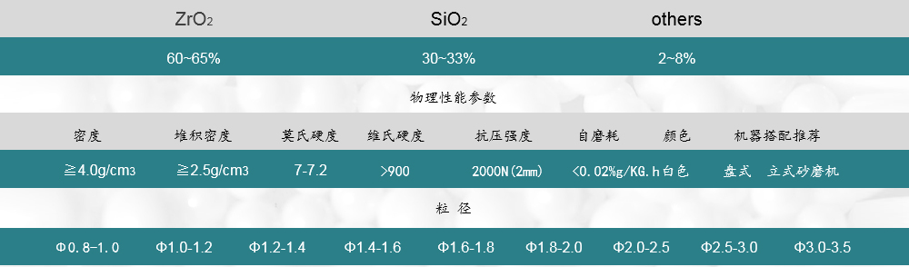 采用滾動(dòng)成型工藝、通過(guò)高溫?zé)Y(jié)制成,珠子內(nèi)部硅酸鋯微粒均勻致密,密度和硬度適中,適合中低黏度物料的研磨和分散,可匹配大部分市面上的砂磨機(jī)。